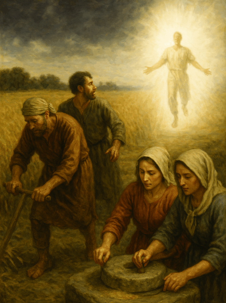“Then shall two be in the field; the one shall be taken, and the other left. Two women shall be grinding at the mill; the one shall be taken, and the other left. Watch therefore: for ye know not what hour your Lord doth come.”